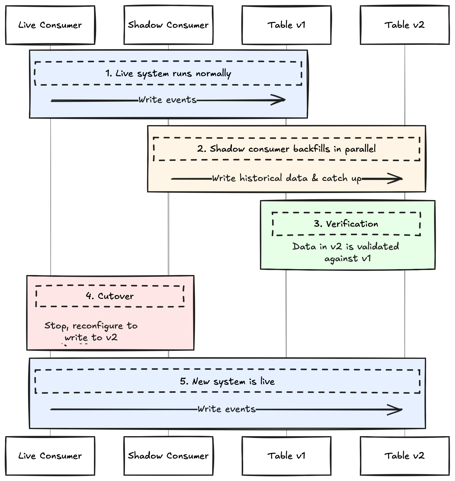v2). Simultaneously, the existing “live” consumer continues its normal operation, writing only to the old table (v1).Catch Up: The shadow consumer runs until it has processed all historical data and is keeping up with the live topic in near real-time.